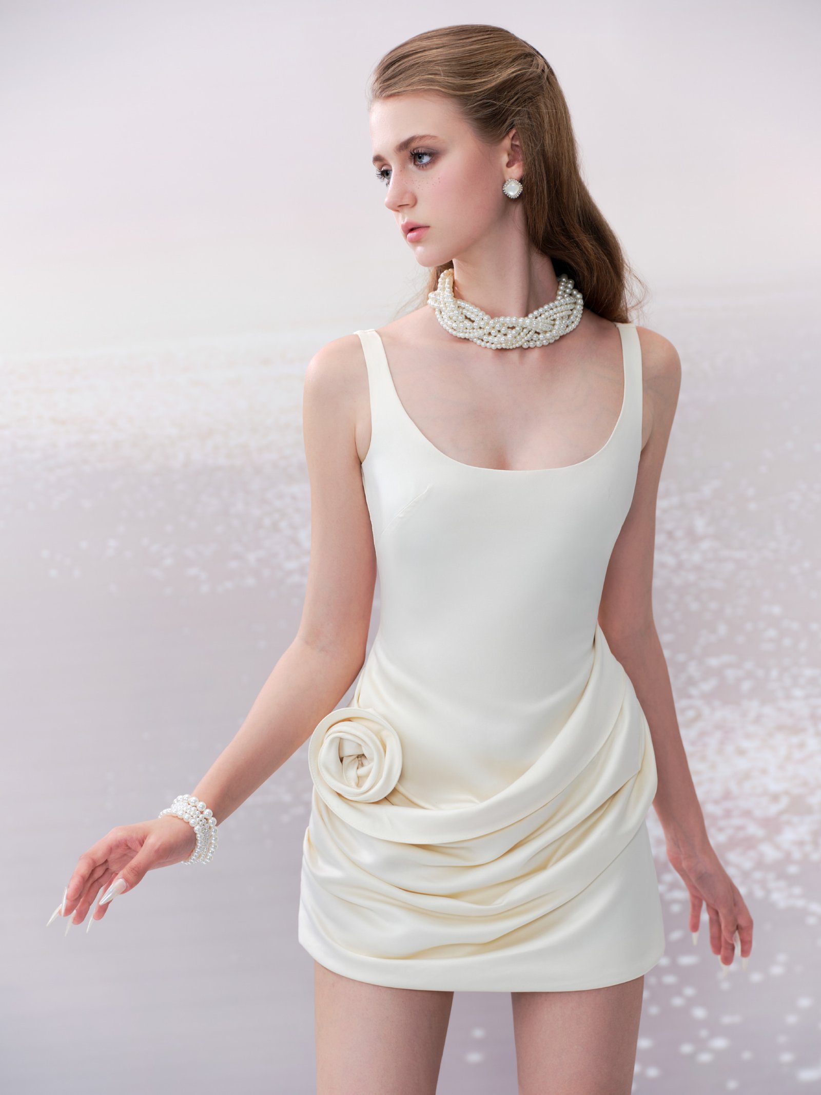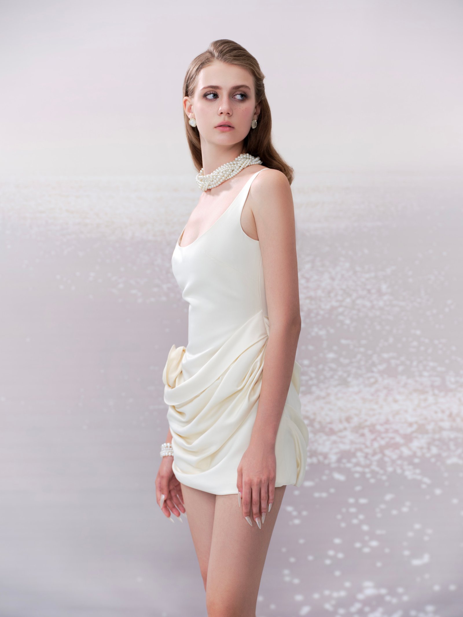 A soft yellow cocktail dress with a square neckline and rose twist detail, elegantly draped to flatter every curve.
