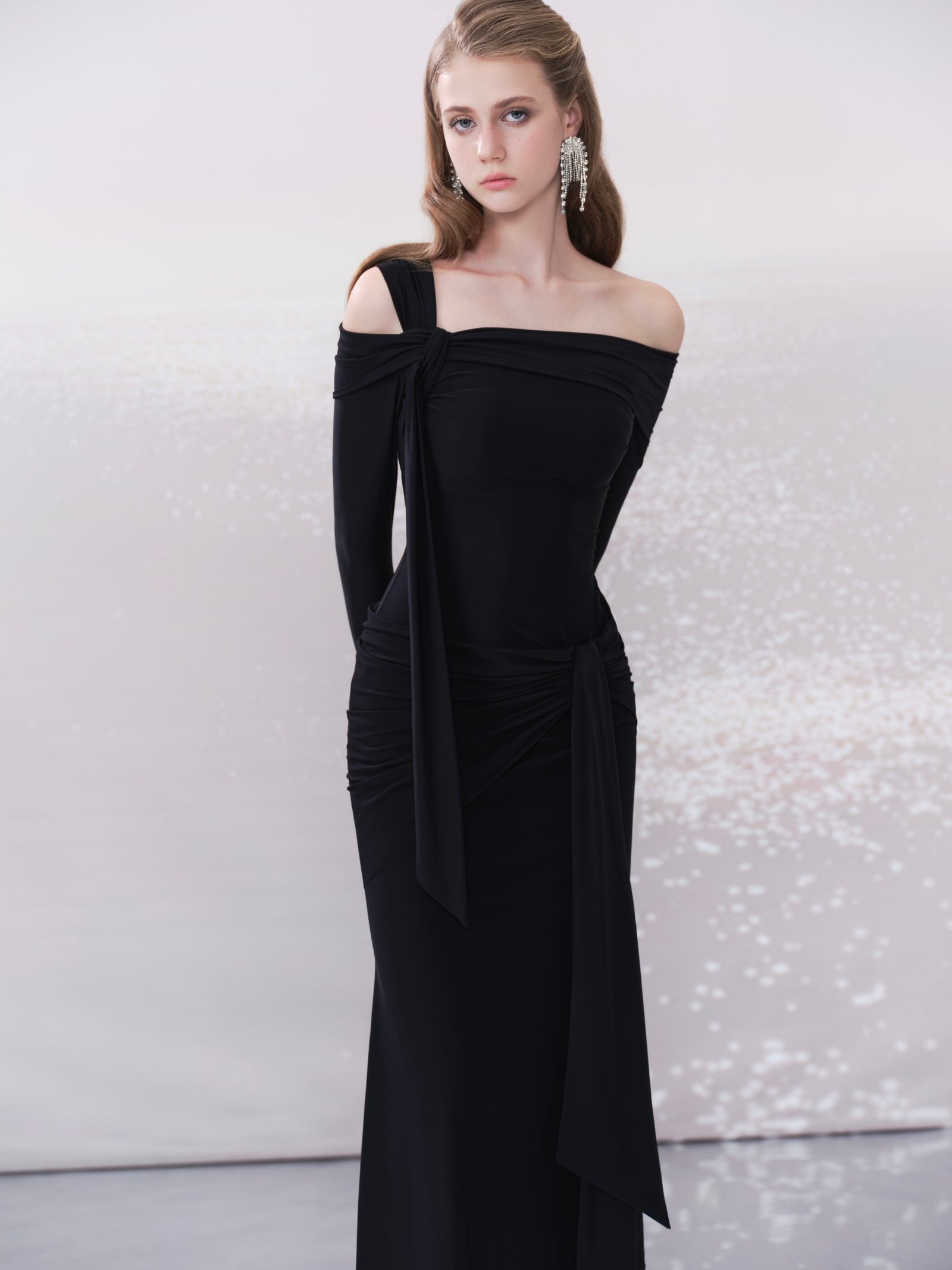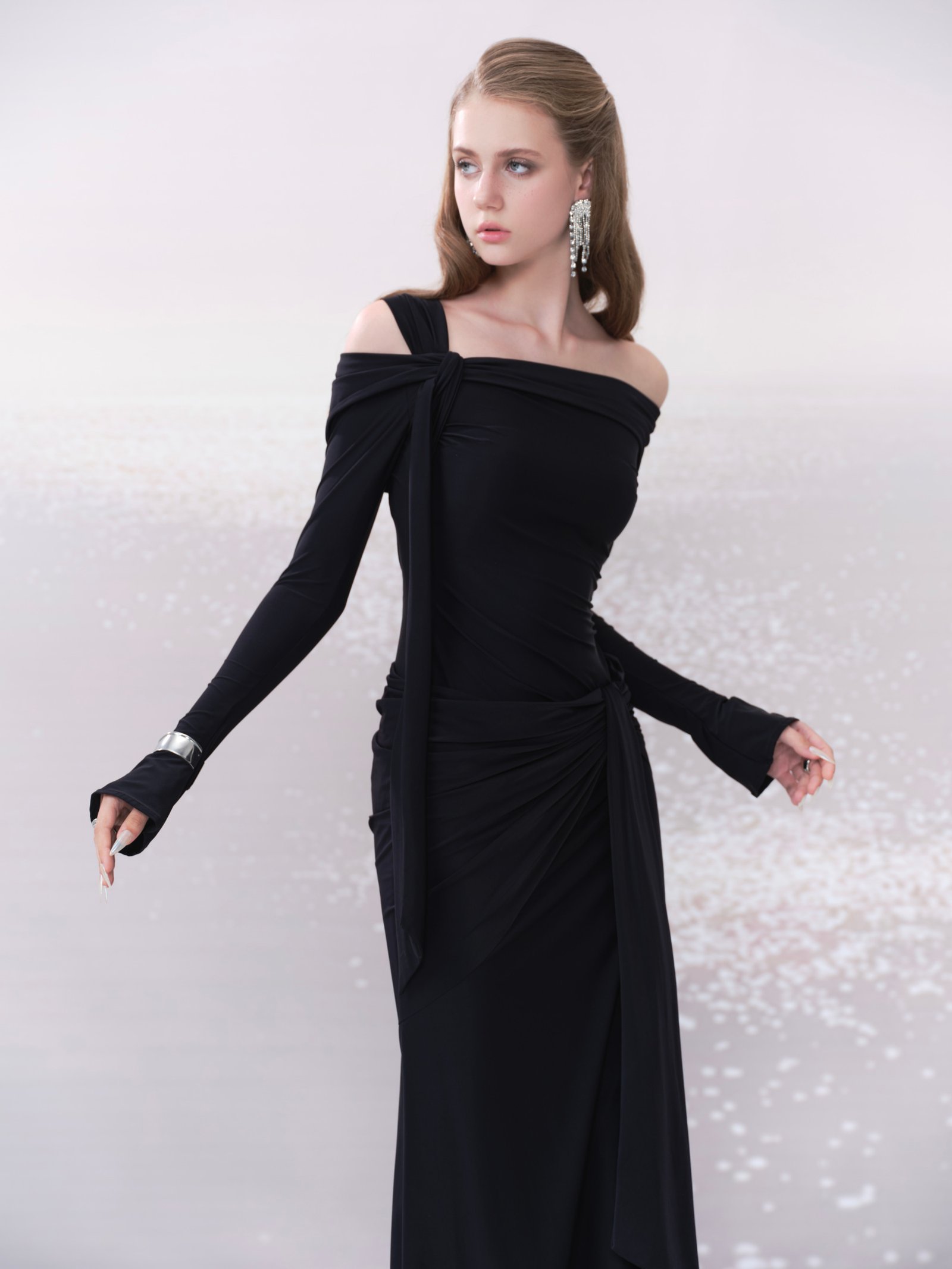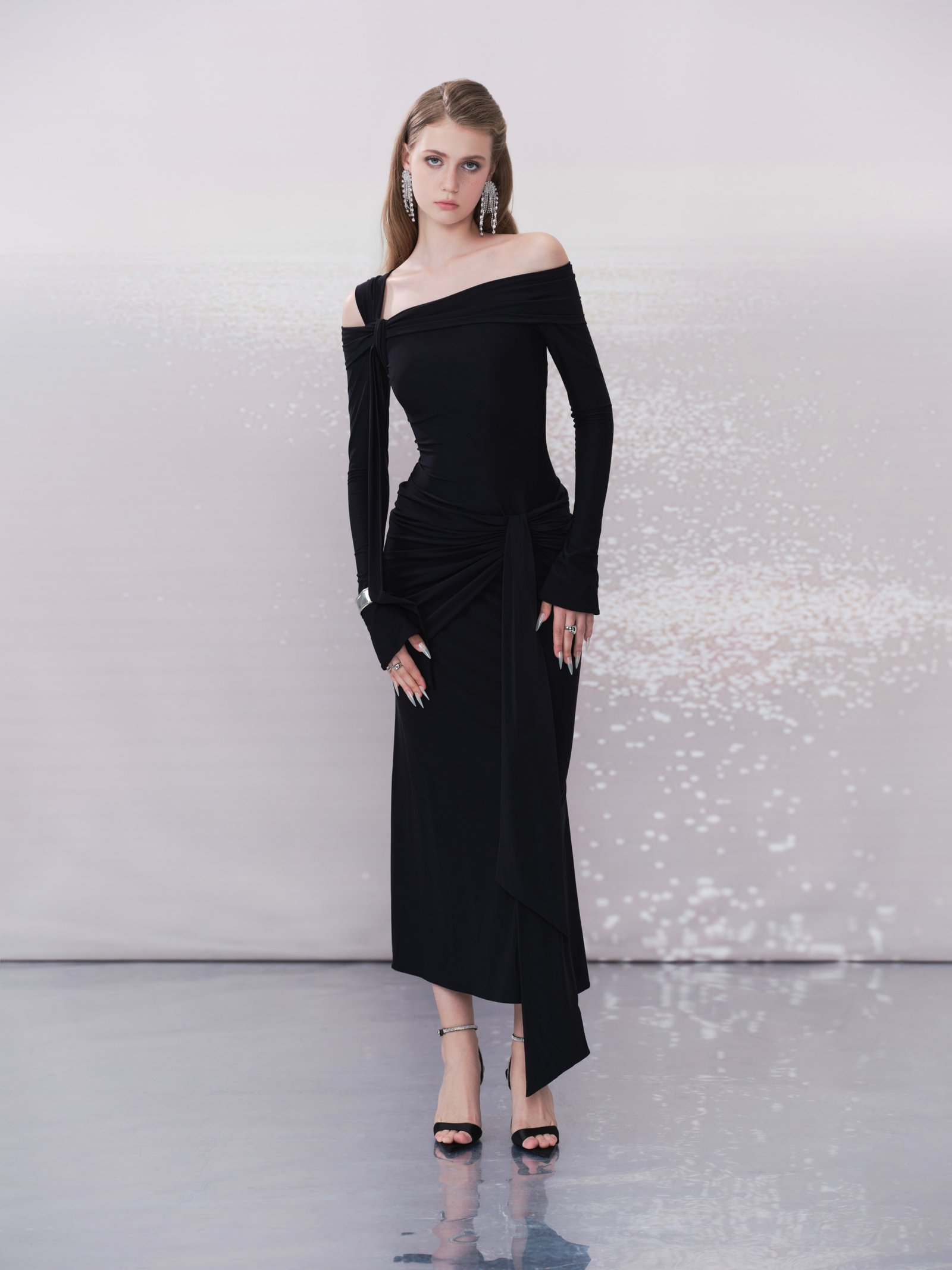 Seyna Bodycon embodies Chocoo’s refined allure, an elegant off-shoulder silhouette that hugs every curve. Asymmetric details and a flowing sash add graceful movement, evoking confidence and unmistakable charm. Material: Cotton